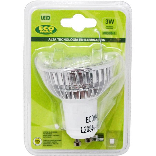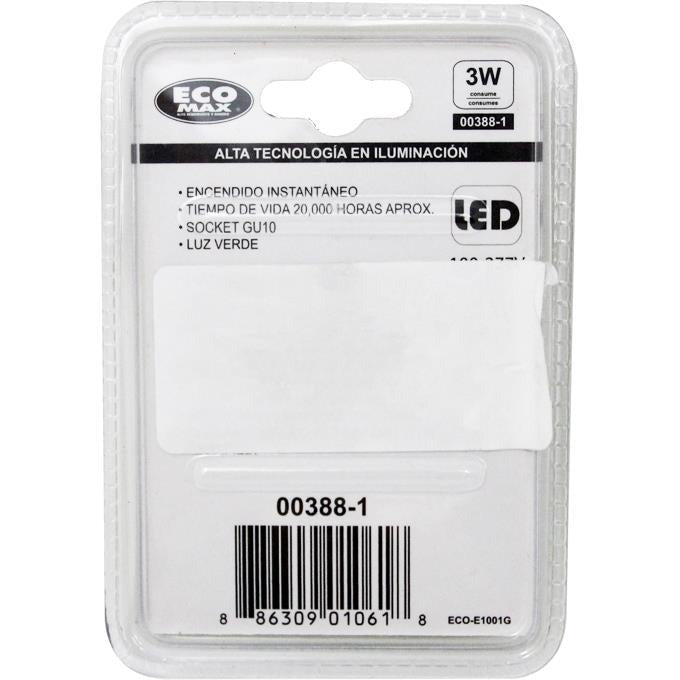 BOMBILLO LED MARCA ECOMAX, TIPO MR-16, ROSCA GU10, 3 WATTS, 120 LUMENS, (LUZ VERDE ATENUABLE), TIEMPO DE VIDA 20,000H, IDEAL PARA RESALTAR TUS ACABADOS EN GYPSUM. 1 PACK.