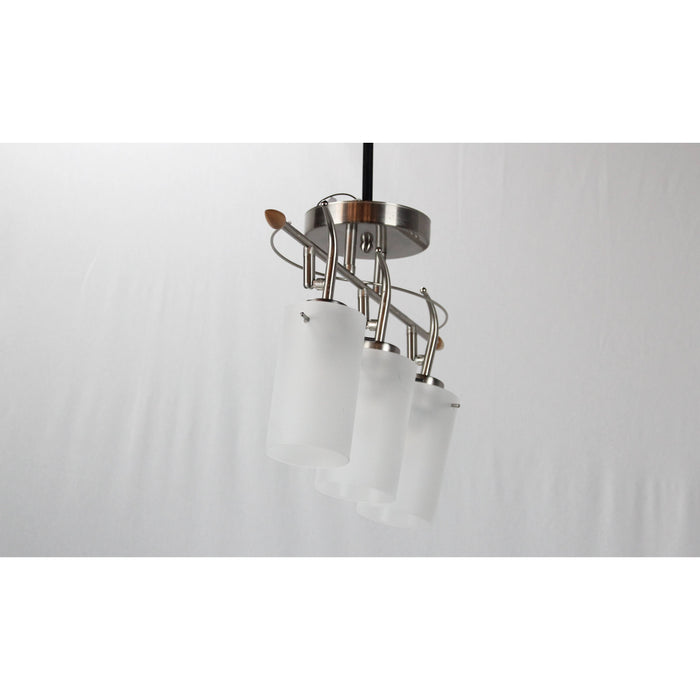 Lámpara de techo de 3 luces de 60W, diseñada en metal, madera y vidrio, con acabados en níquel satinado y blanco, para un ambiente moderno. No incluye bombillo, rosca E27.